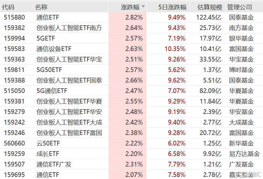 通信ETF、创业板人工智能ETF国泰、创业板人工智能ETF南方、通信设备ETF、创业板人工智能ETF华宝、创业板人工智能ETF华夏、5G50ETF、5GETF、5G通信ETF、创业板人工智能ETF大成、创业板人工智能ETF华安、创业板人工智能ETF富国、通信ETF广发、云50ETF、成长ET、 通信ETF南方涨超2%。